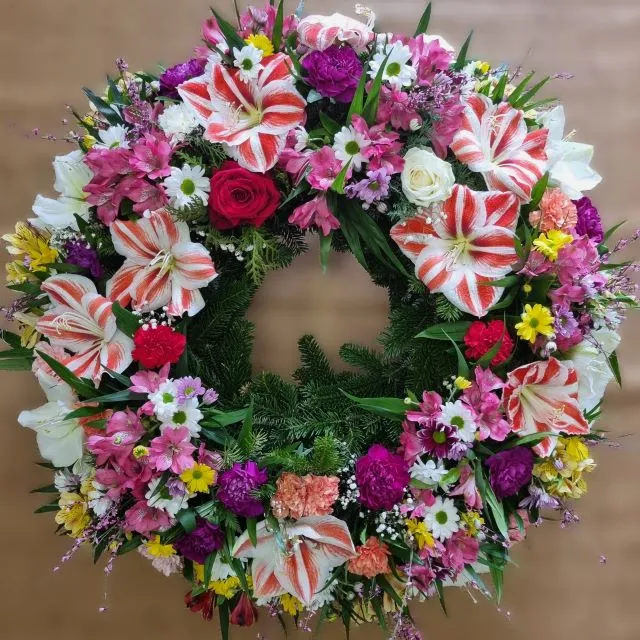 Kranz mit Blumen der Saison. Geeignet für jede Trauerfeier.