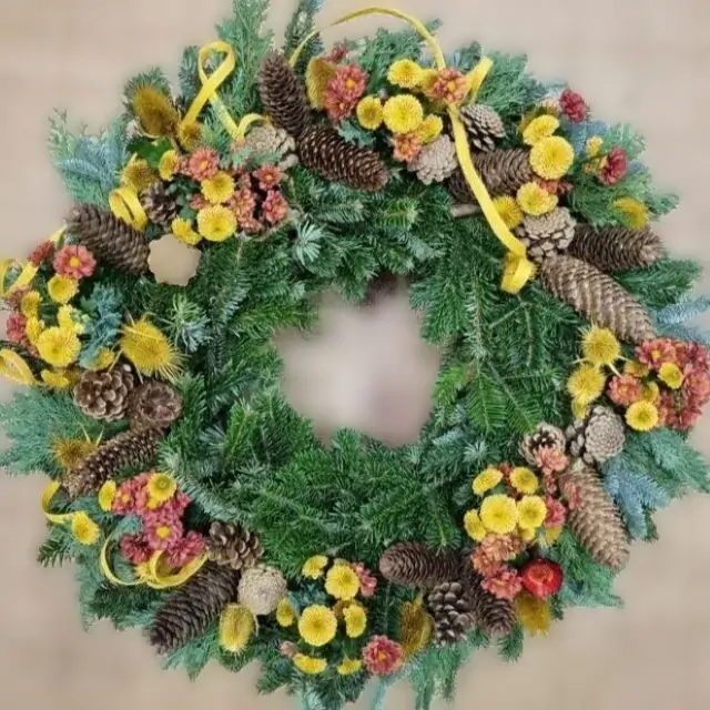 Kranz mit robuster Deko und Blumen. Geeignet für jede Trauerfeier.