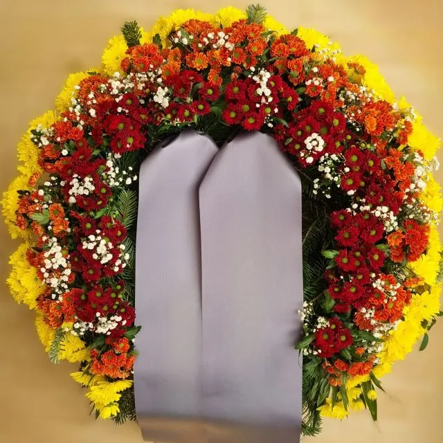 Kranz in den Farben des Sonnenuntergangs. Rot – Orange – Gelber Trauerkranz geeignet für jede Trauerfeier.