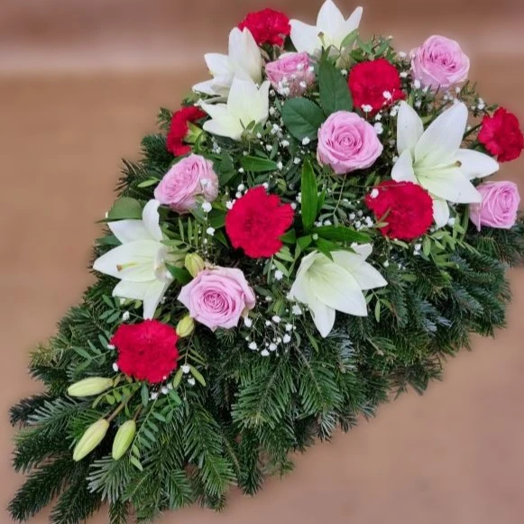 Bukett mit Lilien, Rosen und Nelken. Geeignet für jede Trauerfeier.