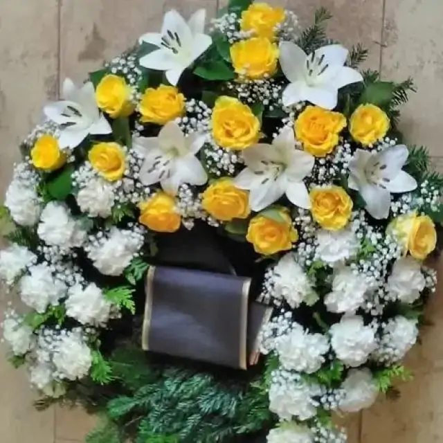 Kranz mit Lilien, Rosen und Nelken. Geeignet für jede Trauerfeier.
