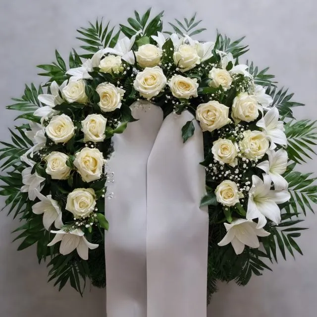Edler Kranz mit weißen Lilien und Rosen in der Farbe Ihrer Wahl. Ein eleganter Trauerkranz. Geeignet für jede Trauerfeier.
