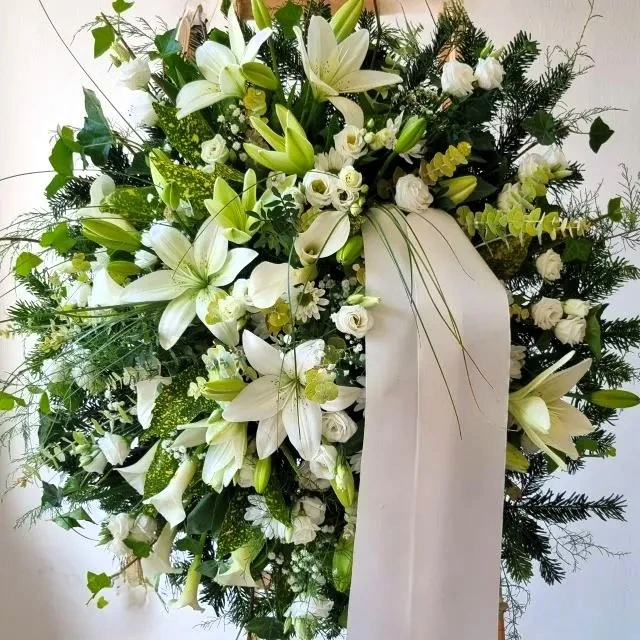 Besonders attraktives und üppiges Gesteck. So groß wie ein Kranz. Mit Blumen in der Farbe Ihrer Wahl. Für jede Trauerfeier geeignet.
