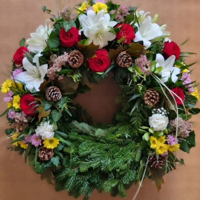 Kranz mit Blumen der Saison. Geeignet für jede Trauerfeier.