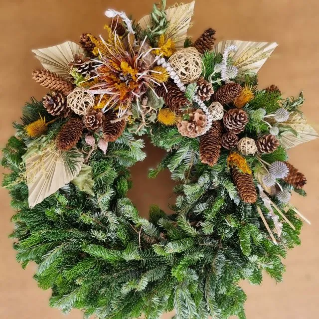 Kranz mit robuster Deko. Geeignet für jede Trauerfeier. Und als lang haltbarer Grabschmuck.